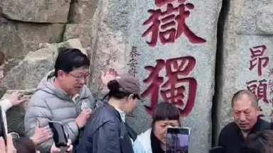 游客爬上泰山五岳独尊石刻拍照